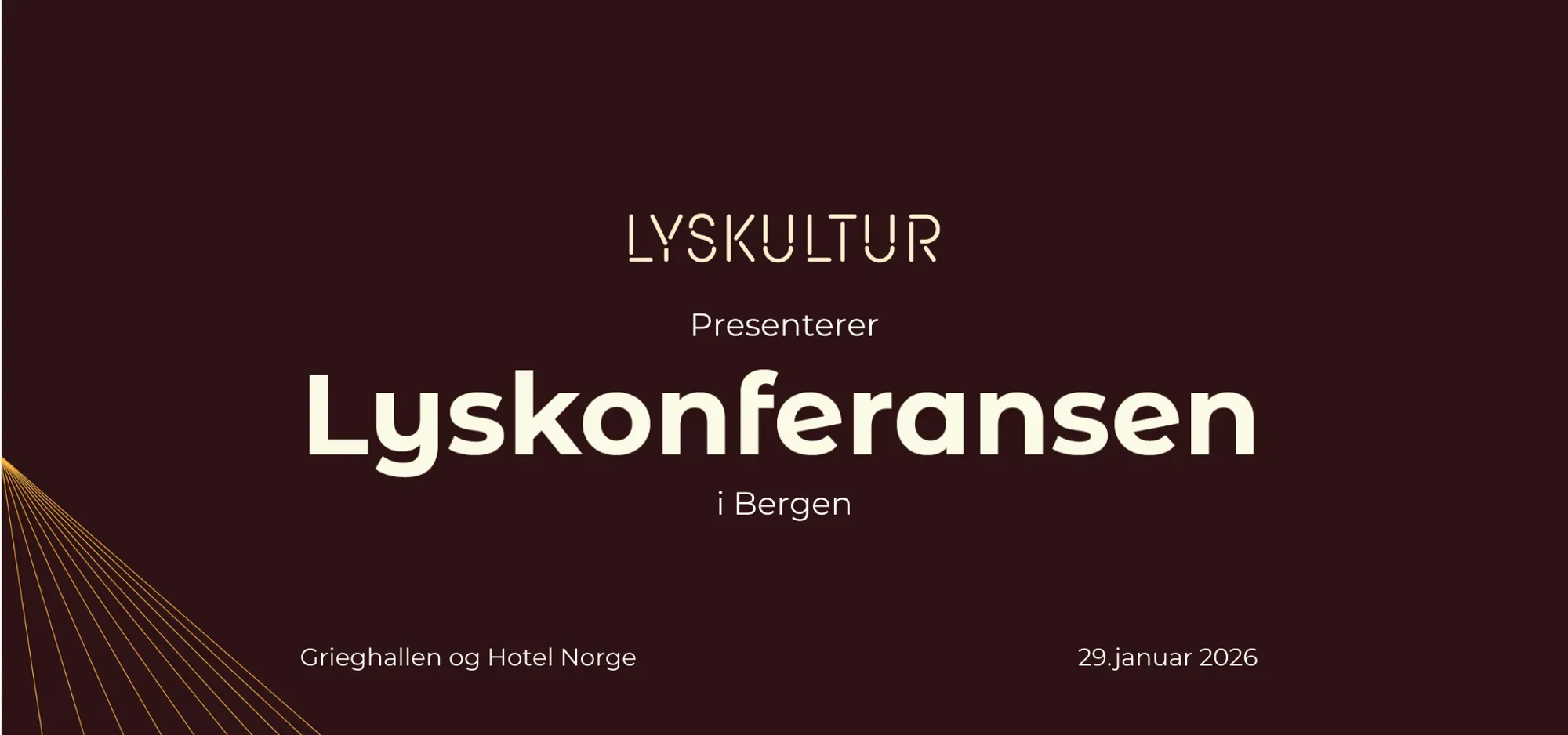 Kickstart året med Lyskonferansen i Bergen 29. januar! Selve konferansen arrangeres i Grieghallen i Bergen sentrum, og er gratis og åpen for alle, mot påmelding. Her har du mulighet til å møte bransjekolleger, kunder, leverandører, se fremtidsrettede foredrag og nyte en treretters middag i godt selskap på ærverdige Hotel Norge. Lyskonferansen i Bergen er arrangert av Lyskultur i samarbeid med Lysgruppen i Bergen.