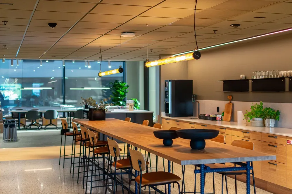 Bygget er tydelig delt inn i arbeidssoner og sosiale soner. I byggets samlingspunkt, Sweco-torget, har de valgt en åpen himling med et skinnesystem med Glamox-spotter som kan justeres etter behov. Under besøket ble de brukt til å lyssette arkitektenes modeller. Løsningen med synlig teknikk under pålimte akustiske plater i arbeidssonene gjør at de har valgt lineære armaturer i et åpent skinnesystem. Her får de ofte kommentarer fra besøkende om hvor behagelig lydnivå det er.