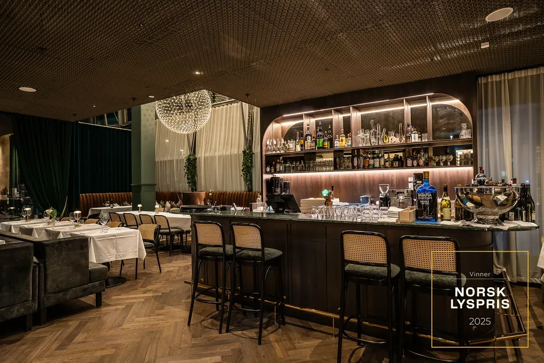 Prosjektet utmerker seg med gjennomtenkt og elegant lysdesign, der hvert grep er resultat av bevisste valg og en tydelig strategi. Lyset er ikke bare en funksjon, men et formende element som løfter arkitekturen, fremhever materialitet og leder brukeren naturlig gjennom bygget. Atmosfæren er varm, inviterende og raffinert – et sted som innbyr til både konsentrasjon og samspill.